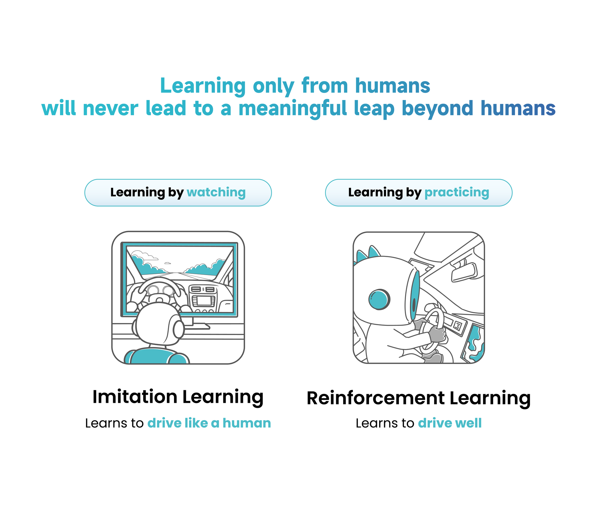 Once the target shifts from “drive like a human” to “drive well,” imitation learning stops being enough.
