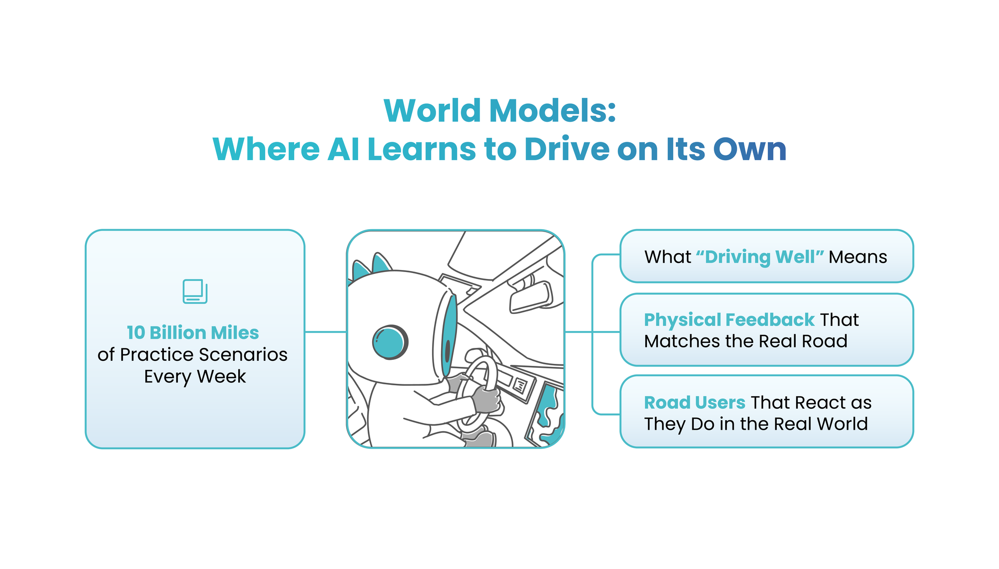 A world model built only on human data can simulate how people respond to people. But once AI driver begins to exhibit driving behaviors that differ from those of human drivers, surrounding traffic reacts differently. You cannot estimate that. You have to observe it.