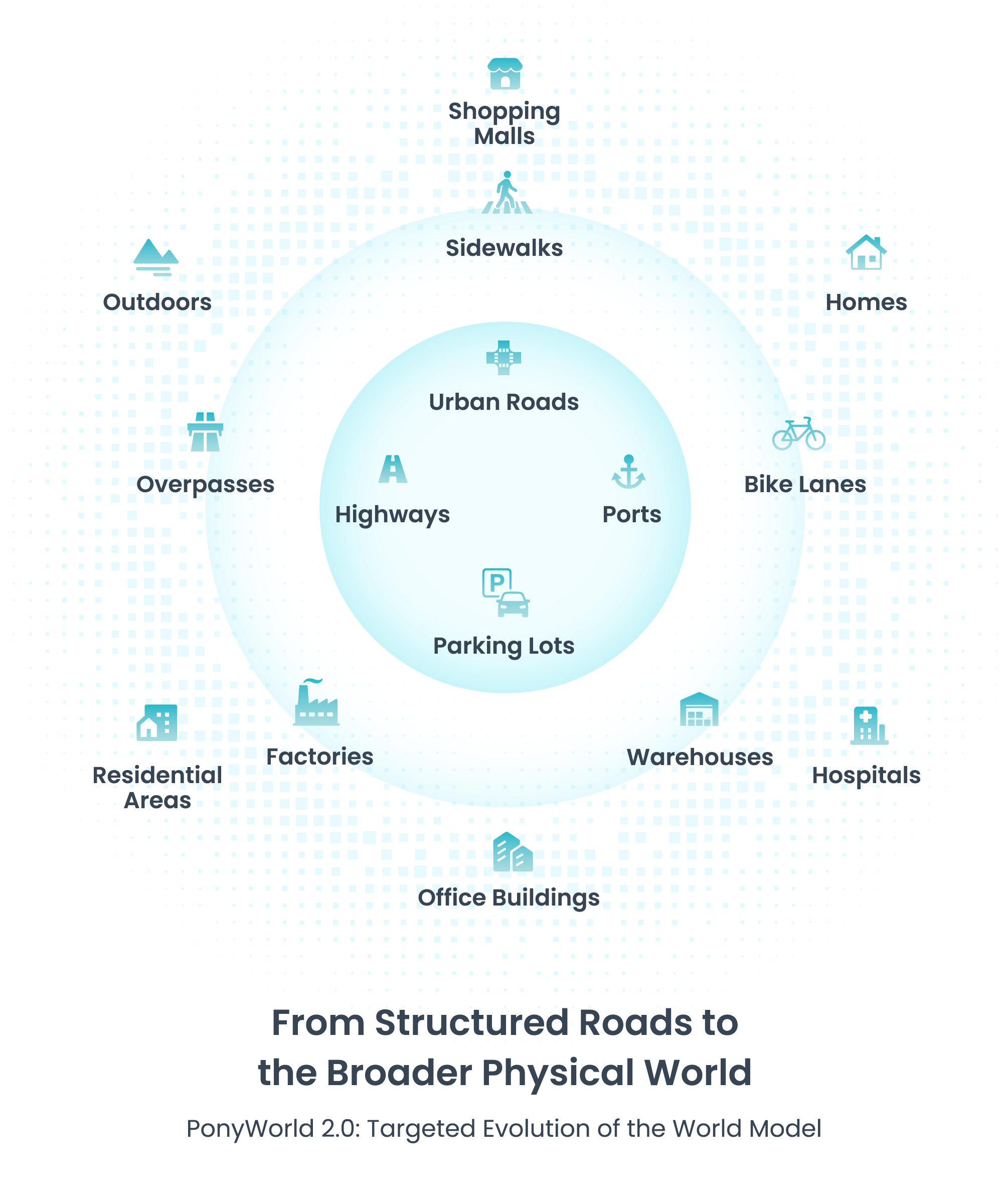 PonyWorld today is an autonomous driving world model. It does not have indoor data. But the underlying capability is not inherently limited to autonomous driving.
